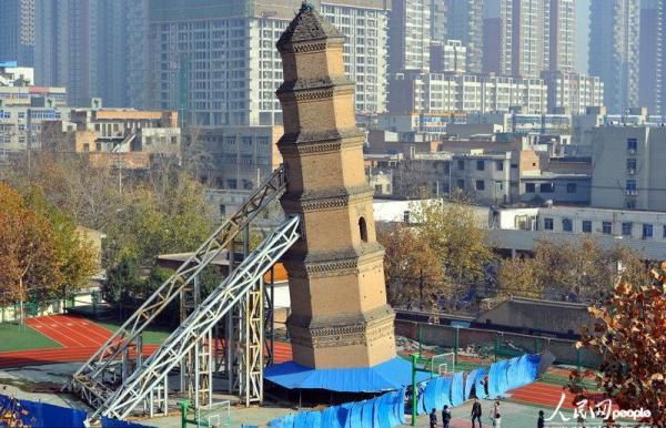 【由头】2012年11月27日,位于西安市东郊韩森寨西光中学南校区的操场上的明代“万寿寺塔”摇摇欲坠,西安文物部门采取了抢救性保护措施,用钢架支撑一年多并进行监测,待今年12月后,倾斜情况稳定后再进行纠偏。