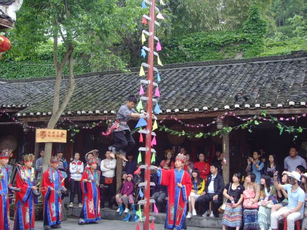 苗族,一个拥有很多神话传奇的名族,赶尸、巫蛊还有一夫多妻却又妻权至上的矛盾又统一的家庭制度。 要进苗王府邸先得唱三首或者喝三碗,或者两者齐上。难得进了“苗鼓堂”,每一场表演都有苗族阿哥阿妹端上米酒来。不过两个节目下来,偌大的苗鼓堂里就处处可闻米酒香。 苗族阿哥表演上刀山