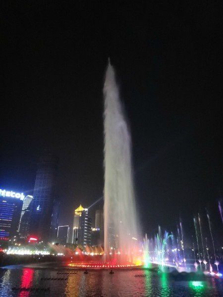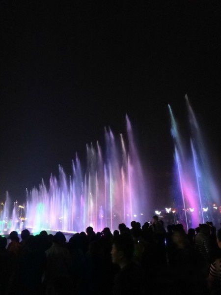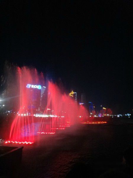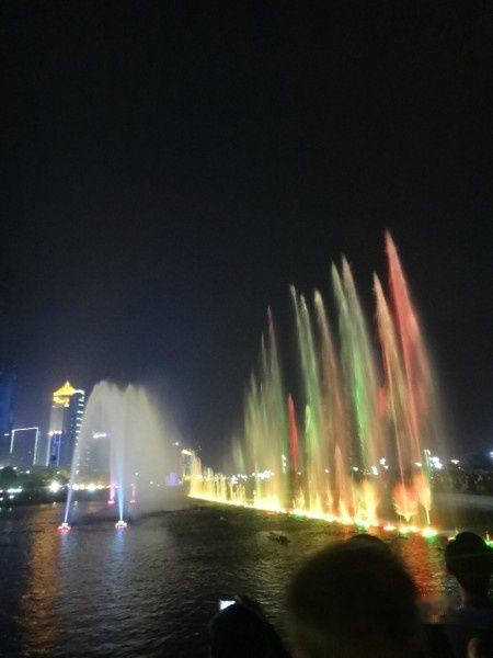 转一圈差不多半小时,等我们排队上去,再下来差不多八点,打车前往了秋水广场,离这边也不远。秋水广场有音乐喷泉,这个还是很给力的,貌似每晚都会在8点开始,大概前后就十几分钟几首歌的时间,喷泉会随着节奏而变幻。