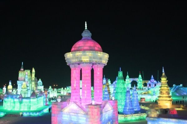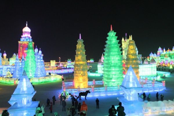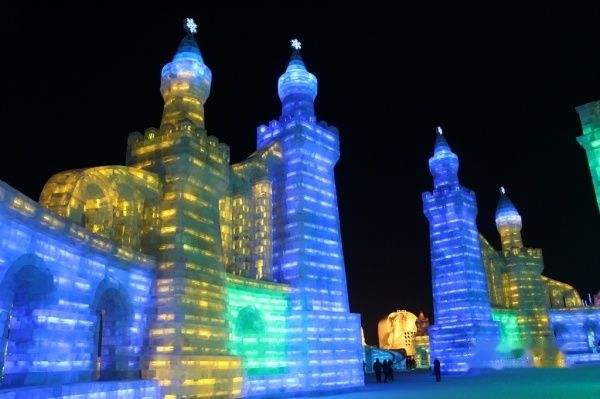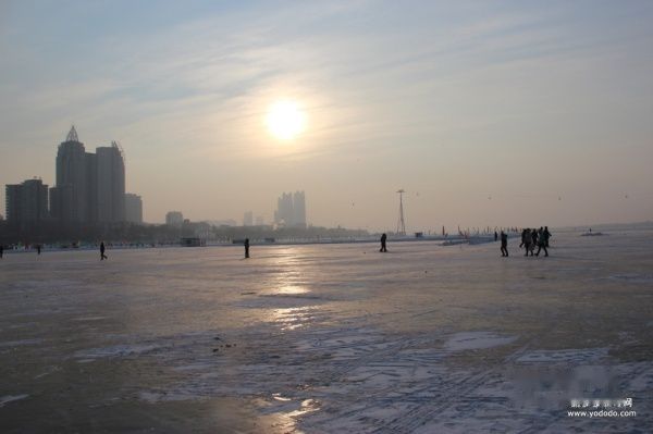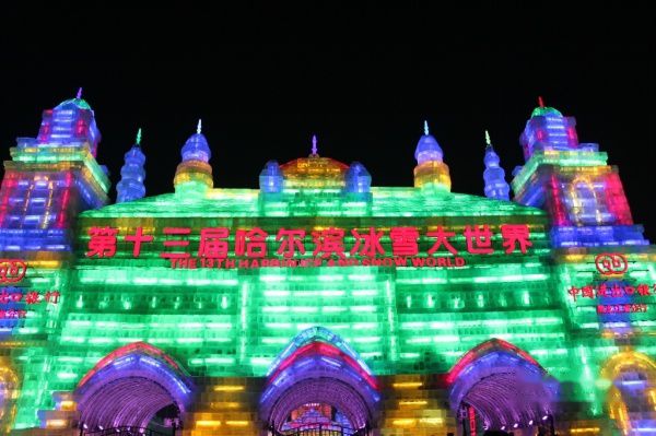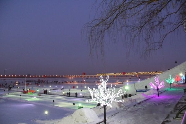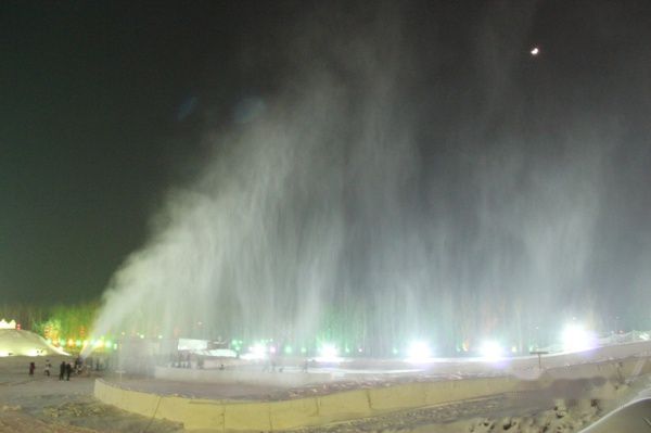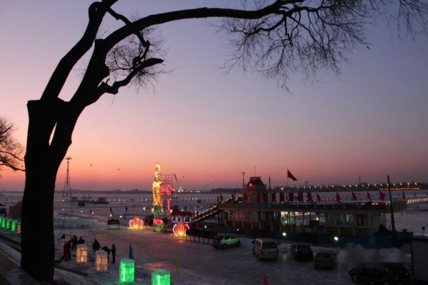 吃完出来又进入中央大街,一直走到松花江边。经过冰冻的江面,来到太阳岛。光秃秃的,没有想象中的那种感觉。沿堤边步行不久,就到了雪博会的大门,门票240元。途中遇着一个的士司机,一路劝说着不要进去,没什么好玩的。在门前看了看,也的确如此。再说今冬哈尔滨也没下雪。于是上了他的车,说是10元钱把我们送到冰雪大世界。由于此时还早,才3时不到,而冰灯要晚上看才有意思。再则在外面也转悠了差不多3个小时了,感觉还是有点冷。在司机的不断忽悠下,随着他来到了松北区的农家乐——吃鱼一条街。虽然暖和了一下,也不得不被腐败了一回,点了一条4斤多的三花鱼(一种无鳞冷水鱼),单价128元一斤。慢慢的吃到6时多,天也黑了,约好的带我们去冰雪大世界的人也来了。哈尔滨的第28届冰雪博览会12年1月8日开幕,而冰雪大世界的有些展区还没完工,故而是试营业,门票呢是试营业期间280元每人,交涉至270元成交。上了他们的面的,不一会就到了冰雪大世界。