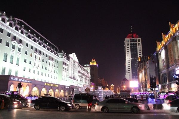 根据网友的推荐,沿着中央大街行至西十四道街附近时,找到了一家老昌春饼店,点了几个小菜,要了几份春饼和筋饼,卷起来吃味道还是很地道的。完后开始购物。在中央大街的秋林红肠专营店买了几斤红肠,27元一斤。俄罗斯巧克力,有20元一片和15元一片的,各买了几片。又买了一些说是俄罗斯的小玩意,不觉中天已黑了。将东西放回酒店出来,已差不多晚7时了。在酒店门前打的到还是网友推荐的位于新阳路247号的同和居,车资10元。点了推荐的干炸圆子,水爆肚等。又到餐馆旁的大北仓酒专卖店,买了一瓶50度的大北仓酒,70元。酒还不错,水爆肚居然是凉菜,不过味道还行,有点特色。餐毕打的回酒店,车资9元。