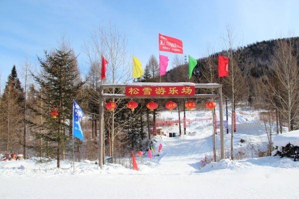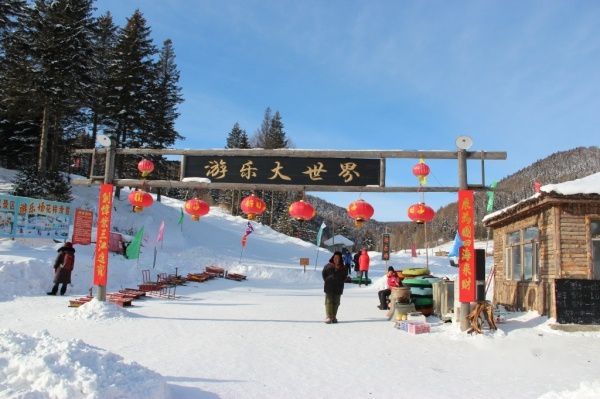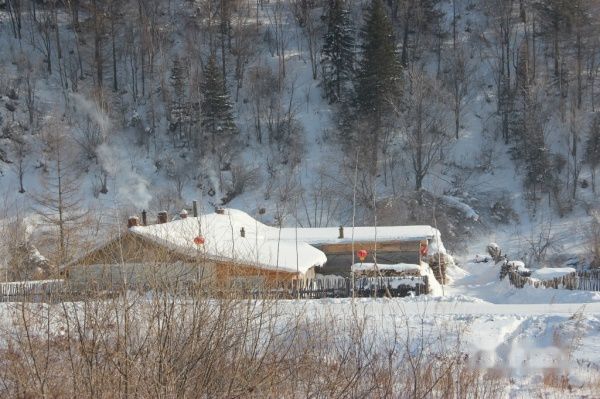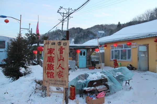 吃完后,剩下的足足打了一大包,车行经过山河林业局快到东升和双峰分岔路口时,路面终于看到积雪了。越往里走,积雪越多,到达东升时,路面已全是积雪。此时已是下午3时。来到通过师傅预订好的东升勇者乐园家庭旅馆,50元/人,含一晚餐一早餐。明天的行程是雪谷穿越,于是我们把不用的行李放在车上,委托司机送至双峰雪乡。