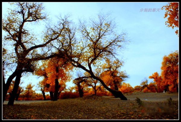 伴着秋风,胡杨果然在等着我,额济纳河畔一片金黄,蓝宝石一样的天、油画一样的胡杨叶子,除了陶醉不知道还能做什么!其实胡杨等着你是期待与你诉说的,这是我走到二道桥才发现的,二道桥的胡杨在一片沙丘里,错落有致的枝影、树脚的落叶和淡黄的细沙,显出一点清淡和空静,这时你的目光会不由得停在胡杨树上,而不只是叶子上,风停时,叶子不再飘落,秋凉里些许落寞的胡杨让你不能不停下来凝视,我看到了两个要分别的胡杨拉着手不愿松开,看到了两个久别的胡杨相拥着低语,看到了没有叶子的苍老的胡杨,如老父亲等着儿女回家一样的守望,看到了沐着夕阳散步的执子之手般的胡杨,还看到了一个领舞的胡杨与他的舞伴们优雅的舞蹈。。。。