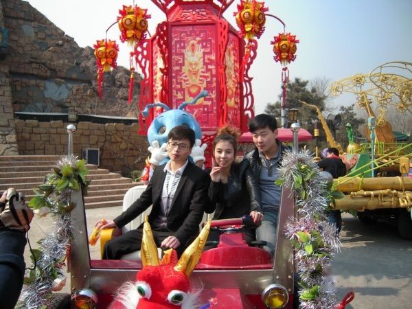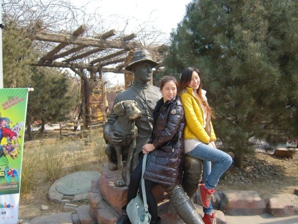 与塑像合影