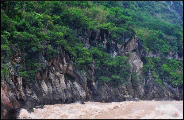 上虎跳是整个虎跳峡景区开发最早的,各种设施也很完备。沿着木楼梯往下走,渐渐感到金沙江的气息,两岸险峰耸天,怪石嶙峋,山岭如刀。上虎跳是整个峡谷中最窄的一段,江面奇窄,江心右侧一个13米高的大石—虎跳石在奔腾的江水中时隐时现,偶尔露峥嵘。