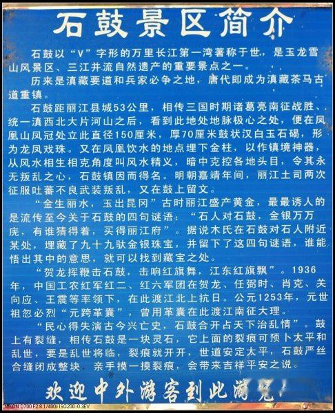 拍完第一湾,顺便在石鼓镇上逛逛。网摘:丽江石鼓镇位于丽江古城西部,东邻九河乡镇、龙蟠乡,南接石头乡,西、北部接黎明乡,距丽江53公里。是历代兵家必争的战略要地,因镇上有一面汉白玉雕刻的鼓状石碑而得名,石碑直径15米,厚0.7米,是目前丽江所发现的年代最早的石碑之一。石鼓为古代滇藏交通要冲,现在仍是通往康藏的咽喉。南宋末年,忽必烈征大理国的西路军,曾在这里与巨津州磨些势力发生激战。元代丽江路官署曾一度设在这里。明朝在石鼓街附近的石门关设巡检司,清代设石鼓汛。石鼓又是中国工农红军第二方面军横渡金沙江的五个渡口之一。参观石鼓上面写着门票5元/人,但由于去的人不多,也没人收钱,随便进。