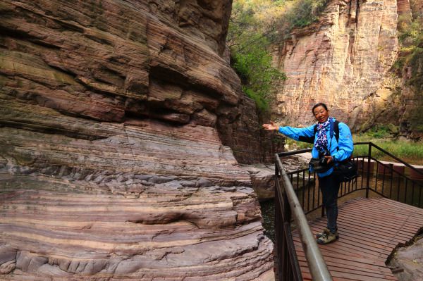 你们看:这就是丹霞地貌,被水冲刷成的彩色波纹石地质奇迹,峡谷内还有很多处。