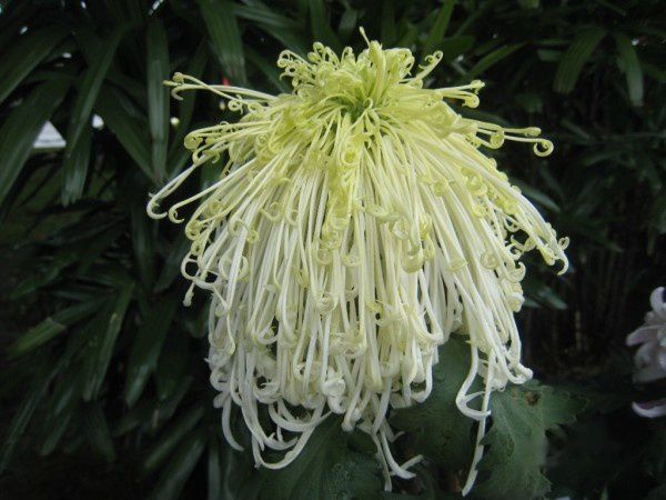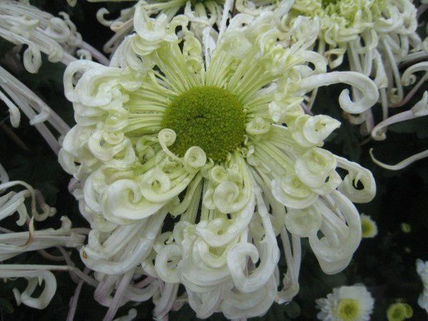 花色老绿,中细管瓣,花属舞环型。外部花瓣直伸,开敞后 稍下垂,瓣端有勾环卷曲。似朵朵彩云’,花色变淡,绿中透白。 内部花瓣正抱,花色浓绿晶莹,不露花心。整个花形丰满大轮, 漫舞潇洒、优美动人。命名“绿云:可使人们联想绿波仙子飘游 太空的美好情景。“绿云”实不愧为深受人们欢迎的一类名菊品种。