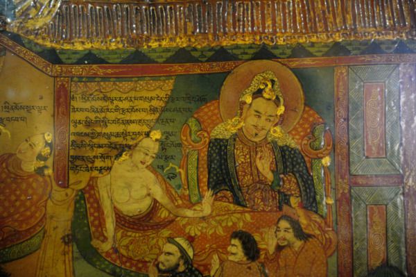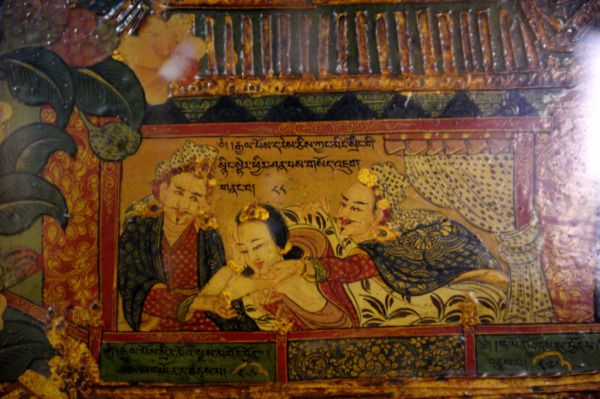 三楼就是厅堂,是历代**修炼瑜伽、闭关静坐的密室,四周的墙壁,画满修炼气功和经脉的壁画,其中以古印度八十位大成就者和二十五位瑜伽师修习密码的图解最为珍贵。不过现在门牌上写着六世达赖的寝室。