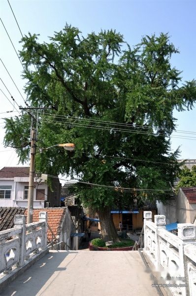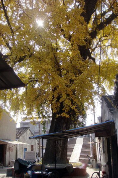 牵系自己对银杏树惦念的背后,其实还是有着一些故事的,其中情结最深的恐怕要算外婆家门口的那颗古银杏了。母亲出身于苏州相城区的太平镇,老屋门前生长着一颗苍劲古老的银杏树,从我小的时候起,每次去苏州,生活起居都盘桓于古银杏树下,渐渐地,古银杏树的形象就在我的脑海中烙下深刻的印象,在这之后相当长的日子里,自己都没有再遇见过树干如此高大粗壮、而树枝分叉又极其俏丽的古银杏树了;并且以前还听当地人说起,这棵银杏树是三国时期东吴的小乔夫人亲手所值——多么令人难忘的动人传说啊!后来从网上获知,此树原为南宋、太尉王皋(退隐之后,定居太平镇)的次子王铎手植,依此算来,距今已有八年百的历史,的确有些来头,也不枉我在40年的岁月里对它一如既往地痴迷和钟情了。2010年8月,我随车出差路过苏州相城区,特地让司机拐道去太平镇停了车,然后只身一人沿老街缓缓寻去,徘徊于古银杏树下,以努力找回最后一次离开这里、那33年前在此留下的点点记忆,同时用相机拍下了古银杏树的英姿。回到上海后,自己在和讯网博客中记下了这段内容,并抒发了无尽的感怀。同年11月26日,我意外地收到了一位昆山网友的回帖,看来他是对阳澄湖沿岸地区的古镇颇有兴趣和研究的人,他告诉我,“那棵银杏树的叶子黄了,很壮观”,接着我在回访他的空间时,惊喜地发现了他在当天拍下的、有着金黄色叶子的古银杏树,我终于看到了古银杏树最美丽那一刻的身形了,自己的心里真的很开心,就像实现了一个期望已久的美好愿望一般。
