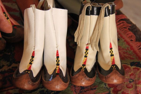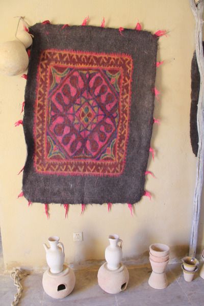 手工制作的小羊皮靴、羊毛毯、土陶罐。