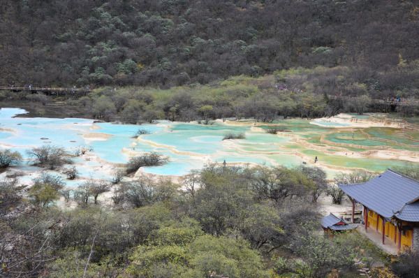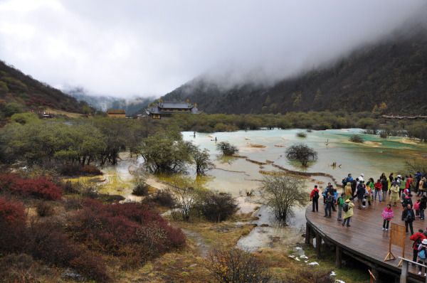 可能山上的树木多,氧气也多,另外,有黄龙是从高处向下游览,高原反应逐渐消失了.在蒙蒙细雨中,走了3个多小时,才到了山脚下.那梦幻的色彩依然在脑海中回荡.使我不禁想起朱自清笔下的赞叹:"那醉人的绿呀,仿佛一张极大极大的荷叶铺着,满是奇异的绿呀。我想张开两臂抱住她;但这是怎样一个妄想呀。站在水边,望到那面,居然觉着有些远呢!这平铺着,厚积着的绿,着实可爱。她松松的皱缬着,像**拖着的裙幅;她轻轻的摆弄着,像跳动的初恋的处女的心;她滑滑的明亮着,像涂了“明油”一般,有鸡蛋清那样软,那样嫩,令人想着所曾触过的最嫩的皮肤;她又不杂些儿法滓,宛然一块温润的碧玉,只清清的一色,但你却看不透她!"如果朱自清当年来到的是黄龙,那又会是怎样的笔墨来描绘呢!