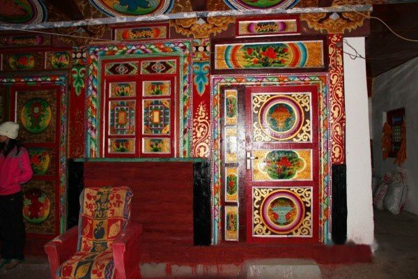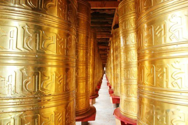 在转经筒(又称“嘛呢”经筒)走廊,我们用力转动着巨大的经筒,口诵六字大明咒,祈愿我们一路平安顺利,一身健康快乐,在寺内大殿,藏族司机和我们一起跪拜佛祖,礼请经活佛颂经开光的佛珠和哈达。住持活佛领着我们礼仰了寺内的七世、十一世达赖的诵经室及寝室(必须赤脚脱帽),