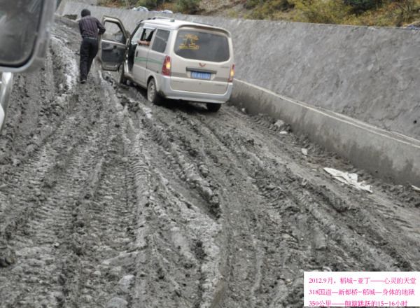 我们这一路时而尘土飞扬,时而颠簸跳跃,时而飞石挡道,时而车陷泥泞, 而这一路风景如画,艳若油彩,身临其境,美不胜收,只是路况复杂无法下车游览拍照留念,新都桥至理塘200多公里路程简直就是一个巨大的建筑工地(理塘至稻城也在修路但路况好些),。尽责诚朴的司机还是尽量挑路况稍有改观的路段作短暂停车,让大家留足欣赏,满足大家的欲望,……