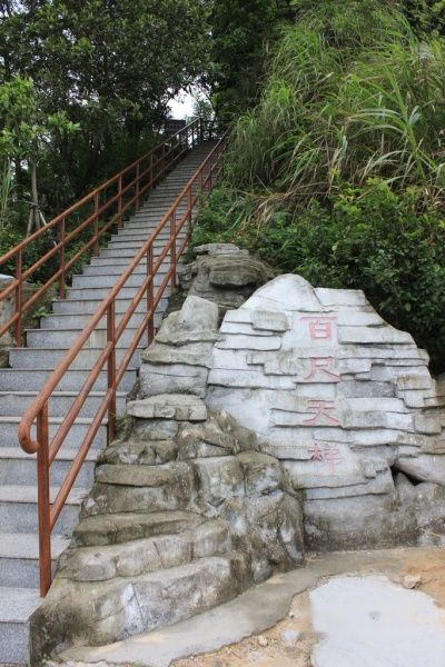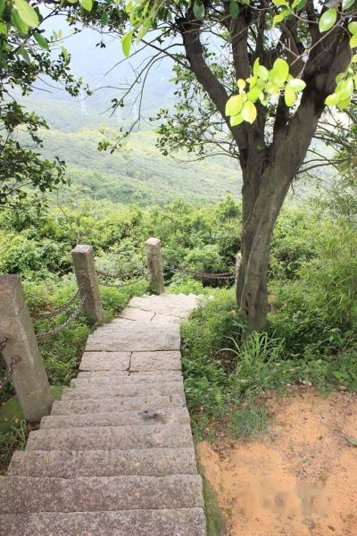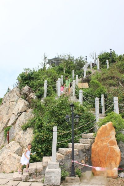 我们来到百尺天梯。由于休息充分了,大家已经不再畏惧。豆豆说走上这个台阶我们就到了中途目的地那座亭子。