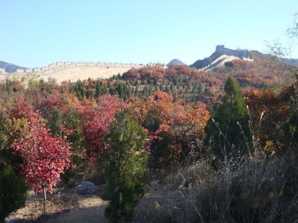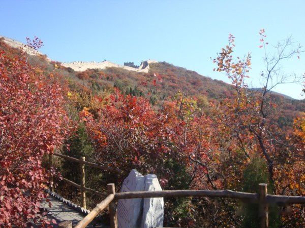 进门后看到的游人还不少,他们肯定都是乘大巴旅游车来的。当我爬到半山腰的时候,就看到遍山的红叶都红了,非常漂亮,在长城的脚下,沿着绵延的长城,红叶映红了长城,那情景,那感觉真是激动人心,这里真是比香山强多了,红叶多成片,红叶红似火,公园在登山途中设置了多个观景平台,为摄影爱好者准备了好的条件,多条上下山的台阶路很好走,这里的红叶和长城不管是谁衬托谁都好,既然是看红叶来的,就算是长城衬托红叶吧。今天的天气也还算好,在阳光的照耀下红叶显得更加艳丽。漂亮红叶的让我不断按下快门,这里的红叶给我留下了很深刻的记忆.......