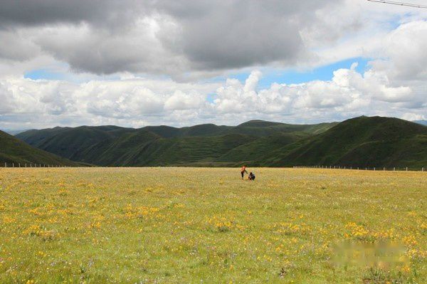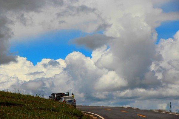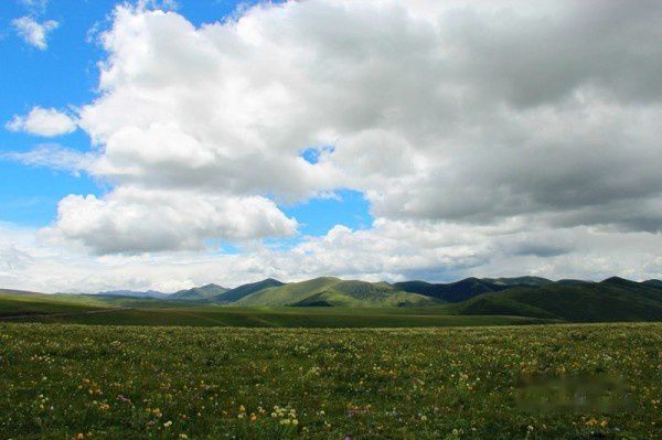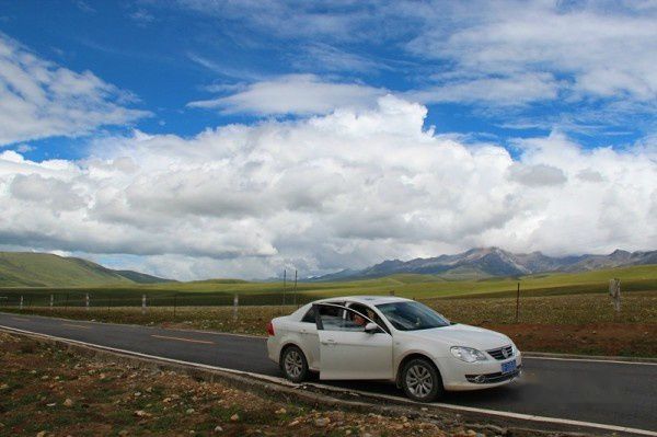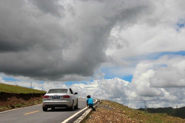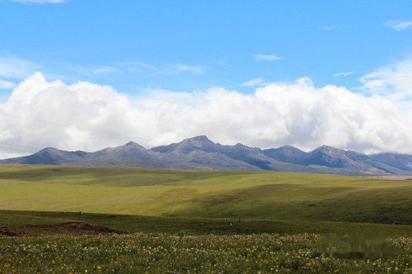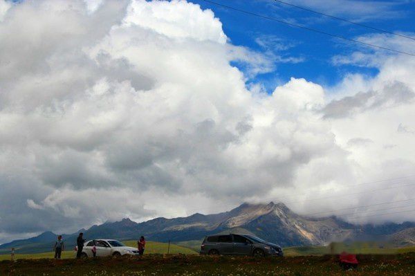 继续开车前行,没有想到的是随后的路程将会是这次康定行里永远难忘的。过了小女孩的家,天气好转,云层逐渐散去,大块大块的蓝天映衬着洁白的云朵,远处起伏的 山峦,周围巨大的草甸,悠然吃草的牛群马群,以及美丽的格桑花,每一处都是绝美的画幅,让你不忍眨眼。