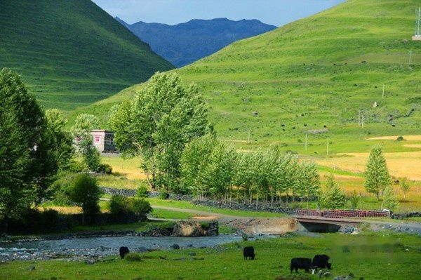新都桥都是这样的景色:小山,草地,河滩,牛群和藏家独特的红房子