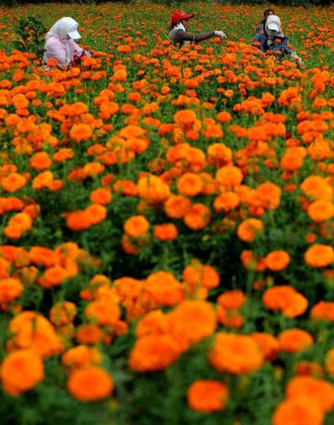 10月3日,开车前往阿斯哈图石林,6点多,经棚已经艳阳高照了,不,应该说是日月同辉更好些,因为刚过十五,月亮还显得比较圆,在阳光的映衬下月光显得那么暗淡。前往石林途中经过一片万寿菊地,满眼的橙色,配着远山、蓝天,怎一个美字了得!