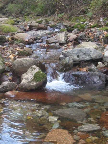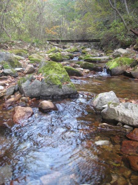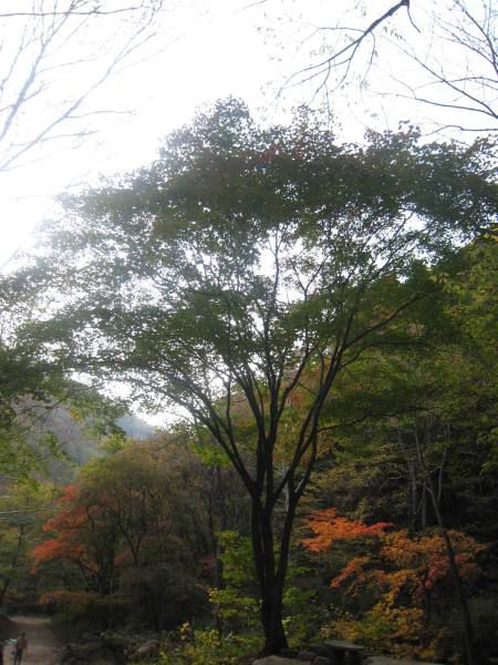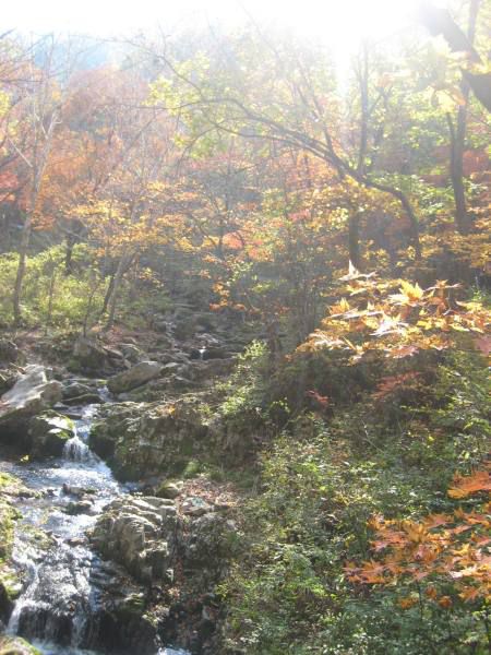 让人联想翩翩,很有意味,虽然是黄金周,但这里游客并不多。一路顺着曲靖通幽的路往上走,溪水潺潺,清澈见底,清新的空气沁人心脾,水中的石头长有绿色的苔藓,据说,苔藓的生存环境对空气质量要求高,如果有污染就不能生存了,一直专注于枫叶和溪水,纷纷与红色的枫叶合影,特别是在枫仙那,后来才知道旁边忽略的没有红色的树才是真正的枫仙,婀娜多姿,优美的景色让人不觉想作诗,女儿吟诗一首,一花一世界,一叶一菩提,一抬头,看了一下天空,美得也是很惊讶,红绿相间,随着溪水歌唱一路来到谷底天门瀑布,环境更加幽静,绿石也更加墨绿,走过绿石谷,感觉走过了两个季节,一个是枫叶正红的秋季,一个是新鲜翠绿的树林,以至于我在那里迷惑了半天。
