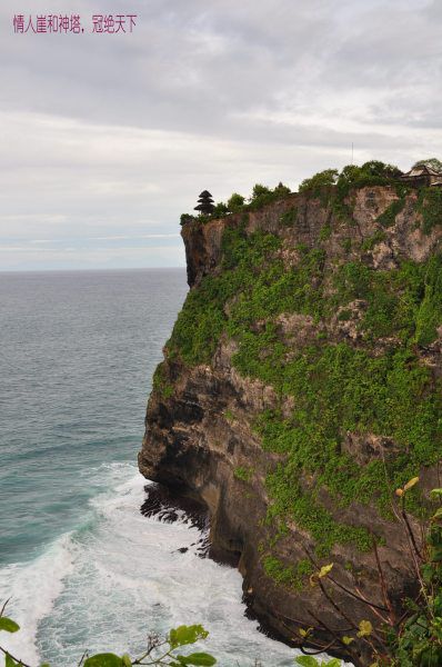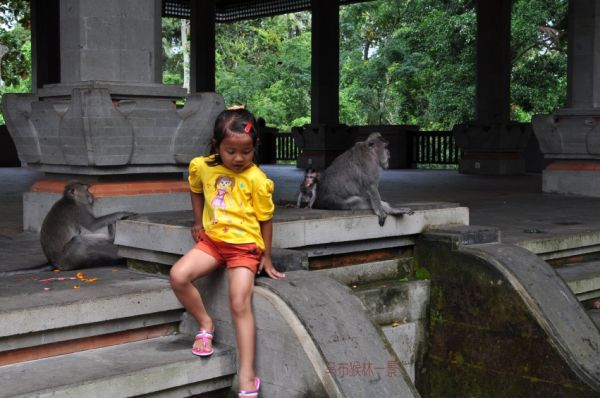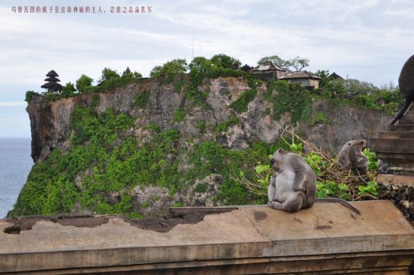 果然一个下坡再上坡之后,进入公园门口的开阔地,有群猴子漫道而过,目中无人好似巡视的威武之师,来前听那家人警告:小心被猴子夺去眼镜。大门仅是门柱,有猴在柱而没人看管又享受免票待遇了,顺主路前行耳朵听到海浪声就是快了,有很大古建遗迹表示到了,阶梯上行终端就是海神庙的神塔所在的悬崖尖端,当然最后的小院是上锁禁行的。我先左行去建有水泥道路和围栏的崖岸,看到神塔所在的山崖向前伸出,再前行数百米,回看那神塔和那崖,亦如照片所示超然海上了。。。取景拍摄,一旁有猴或嬉戏、叫喊、昏睡,两不干扰;甚好