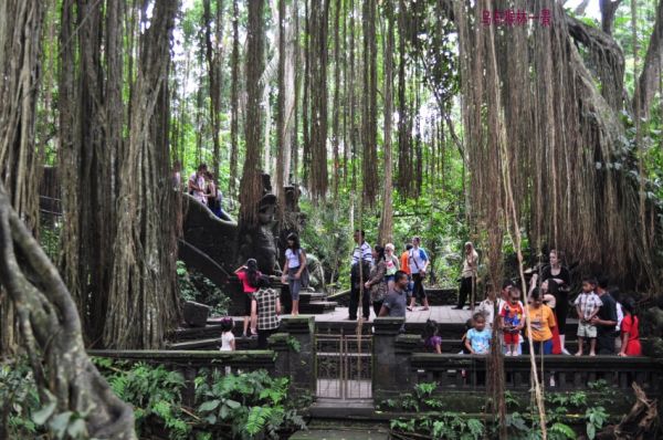 第二天被公鸡们吵醒,决定去猴林、王宫、博物馆转转。猴林中地形起伏,几座庙宇散落各处,有巨沟贯穿其中,有一巨大的根系横跨沟涧很是壮观。而猴子主人到处可见,有的确实会袭击女游客,不知是否公猴?