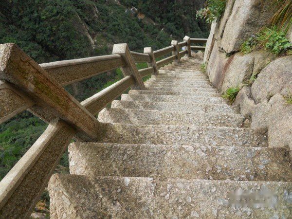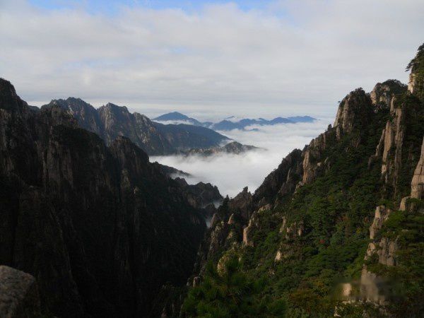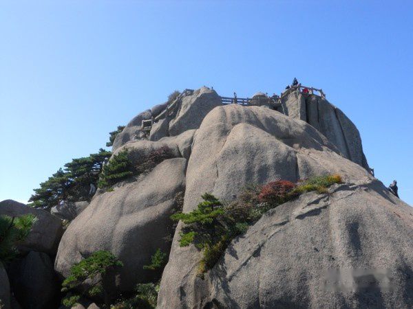 日出完毕,回宾馆整理一下行李,经海心亭,到鳌鱼峰。穿鳌鱼洞,登百步云梯(800阶梯),征服黄山第一峰(莲花峰)。山路陡坡,步步惊心,但景色格外美丽,壮观。