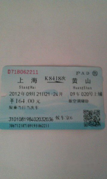 由于第二天06:38的早班车被长期取消了,我们只好提前一天晚上出发。上海到黄山的火车只有这一班K8418。