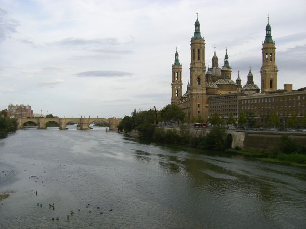 隔河眺望有着11座圆型穹顶的萨拉戈萨圣女皮拉尔大教堂