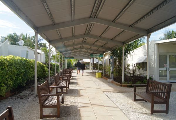 岛上的服务设施都集中在这里,有小旅店、纪念品商店、餐厅、潜水器具租借处、教育中心等等;所有的建筑都是白色。餐厅提供免费自助餐和咖啡茶水,还售卖各种酒精饮料。教育中心教授潜水技术、介绍海洋动植物的种类和特性。