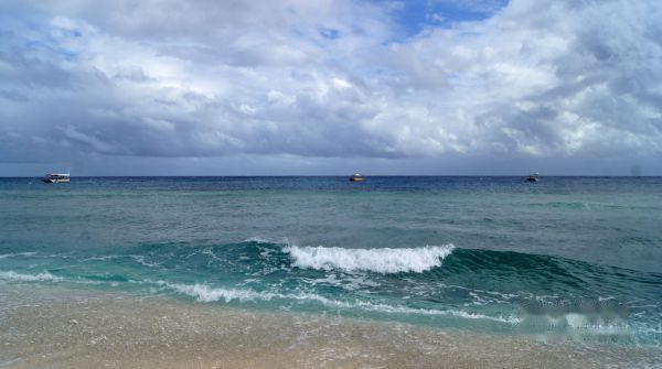 10点多我们刚刚借好了浮潜器具就下起了瓢泼大雨,一直等到11点大雨都没有停,只好改变计划先去吃午饭了。午饭后雨小了一些,冒雨登上了玻璃底船。玻璃底船在风雨中颠簸摇摆,我双手紧紧抓住船舷,双眼紧紧盯着船底,生怕错过海底的美景。海中的珊瑚色彩艳丽,千姿百态,有红色、白色、粉色、黑色、灰色;有的像棵树、有的像盘磨、有的像朵大蘑菇,......。大大小小的鱼儿像在海底大花园中起舞,舞的最美的要数魔鬼鱼,几米长的双鳍展开上下翻飞;最不会舞的就是大海龟,短短的小腿怎么划拉都不美。船到锚地停下来,女儿和一些游客下到海中游泳、浮潜。雨一直不停地下,玻璃底船只有一个顶棚完全不能遮蔽风雨,照相机也不敢拿出来拍照。风雨实在太大,不得不提前返航了,返航的途中把中午吃进的东西都吐在了海里。