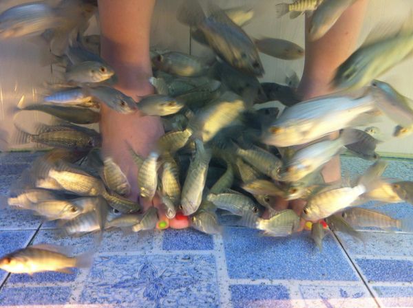在路边看到Fish Massage,早就想试试看了,一人2刀。真是奇妙的感觉啊!(这旁边还写了“Non Piranha”,没有食人鱼,大概以前发生过食人鱼混进去咬人了吧,哈哈)