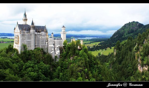 山脚下,是巴伐利亚的壮丽山河,沃野平畴,绿草如茵;高天上的流云,在森林和原野投下忽明忽暗的影子。那美仑美奂的石头城堡,就像是从岩石里长出来的一样,孤零零地伫立在峭壁巉岩之上,遗世而独立,仿佛天上宫阙,美得孤寂而超然。无法将它和童话世界里美丽单纯的梦幻完全画上等号,因了解其来龙去脉,总让人不免想起那个疯狂的路德维希二世。