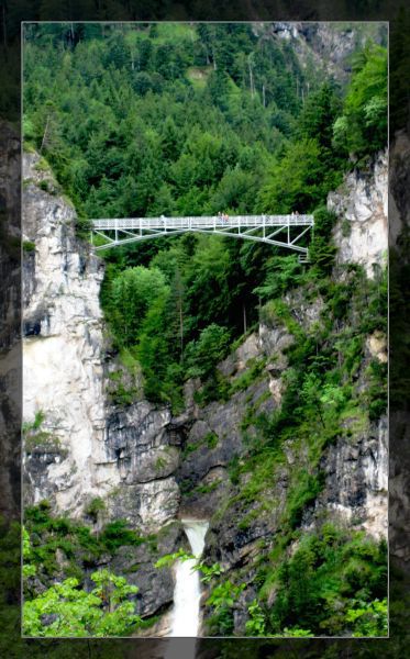 从古堡出来,绕到后山的玛丽安桥,这窄窄的铁桥架在峡谷之间,从铺在桥面的木板缝隙看得见脚下的深涧,恐高的我胆战心惊地拍了几张天鹅堡的标准照,完成每一个到此的游人必会完成的规定动作。遗憾的是天鹅堡正在维修,那些防护网脚手架多少有些煞风景。