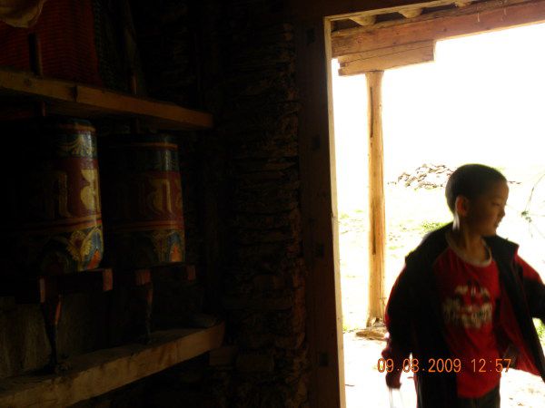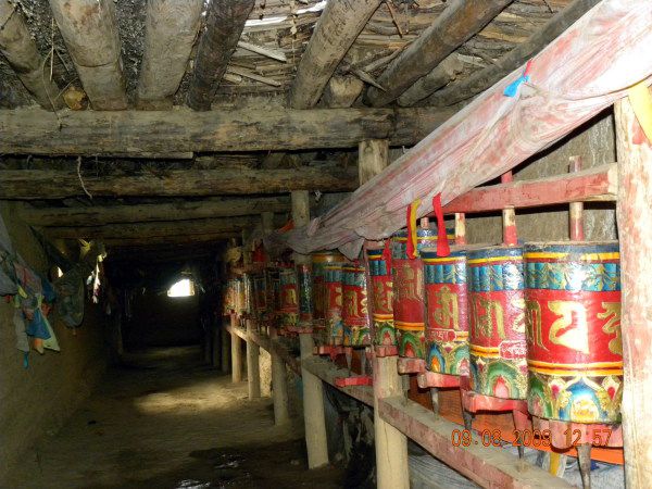 没有了狗的困扰,开始仔细打量着座四四方方的建筑,原来这并不是什么寺庙,而是一个转经廊,可能是属于山坡下面一点那个村寨的吧。转经廊看来已有了一定的岁月,院墙是黄土夯成的,并围成一长方形,上面间隔一定距离开个小窗,用于采光,前后两面院墙中间各有一道大门,木质的大门已显斑驳,从门边转经廊入口进去,里面光线很暗,右手边一排排木质的转经筒沿着土墙整齐排列,形成一个回廊,转经筒下的木把手因为信徒的长期抚摸变得光滑油亮,似乎诉说着这儿曾经并不寂寞,踩着脚下坑坑洼洼的土路,挨着转动每一个转经筒,吱吱呀呀转动的经筒仿佛传递着来自另一个世界的信息,回荡着神的话语,在这空寂无人的山顶转经廊里回荡......