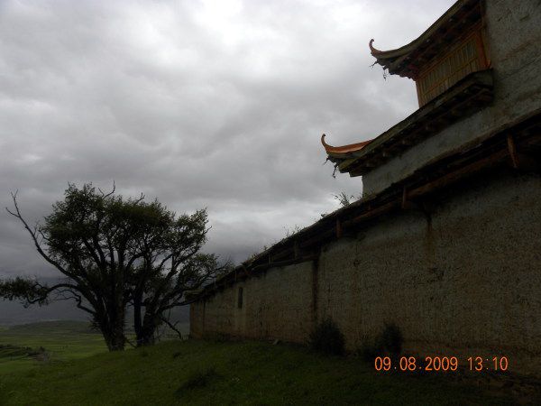 一路狂奔到达山顶,嘿嘿,还好,居然没有高原反应,看来我还是很很适合高原生活的嘛。顺着院墙前行来到门前,大门紧闭,听不到人声,却传来一阵狗儿的吠声,绕着院墙继续向前转了一个弯,一条脏兮兮的藏狗拦在路前,凶巴巴地朝着我们狂吠,吓得我赶快用伞对准它,还是LG从容,拿出几片我们准备的午餐:卤牛肉朝它抛去,嘿,真滴是应了那句话:“有奶就是娘。”,那狗立马停止狂吠,并极力摇尾示好,并在此后的两个多小时内与我们如影相随,不离不弃了。