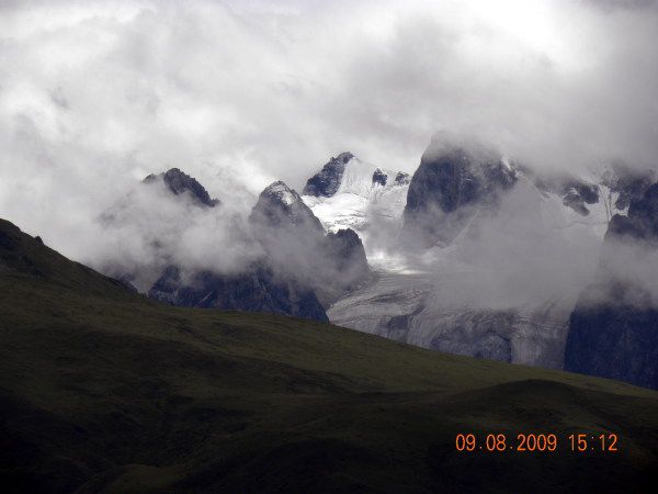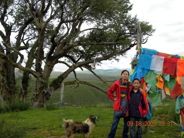 俗话说:“高原的天,娃娃的脸。”,不一会雨过天晴,太阳又重现笑脸,蓝天如洗、愈发澄明,转过拐角,前方有一大树郁郁葱葱,树边经幡飞舞,照了几张相,慢慢下行,下面山坡绿草如茵,鲜花灿若繁星,远处雪峰矗立,半山的村寨上空桑烟袅袅......我和LG忙着照相,儿子也忙着招呼他的新朋友,只听见他一会叫道:“乖狗狗,走这边。”,一会又丢一块牛肉在草地上,并不断地指挥:“还没找到?笨,在这儿呢!”、“OK,完全正确!”......那摸样,时而像一个唠叨的管家婆,时而又像一个指挥千军万马的大将军,看来,他已经完全找到属于自己的乐趣了。
