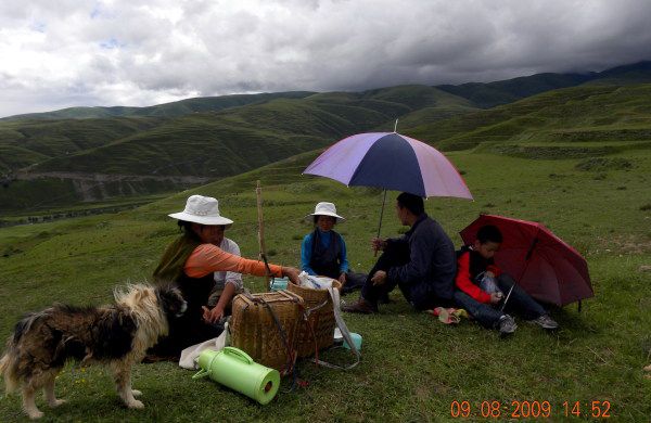 经过攀谈,得知女主人叫德甘,和其丈夫、婆婆在此放牛,他们家就在我们刚才经过的那个看起来没有几户人家的小村寨,家里养了60多头牛、几匹马,在院子里种点菜,基本自给自足,有两个孩子在山脚下的学校上小学,每天日出而作、日落而息,放牧、挤牛奶、烧茶做饭、转经煨桑,偶尔到山下县城一逛,生活简单、平静,LG竖起大拇指对他们说:“你们的生活好巴适哈,我们真羡慕!”,男主人憨厚地笑着说:“我们也觉得我们的生活可以,你看,我们的牛长得好好地,我们的两个娃娃在读书,中午饭在学校吃,不给钱,学费政府还给出嘛。”瞧,多么知足的少数民族朋友,而越简单、越知足,不是就越幸福吗? 祝福德甘一家的幸福生活!