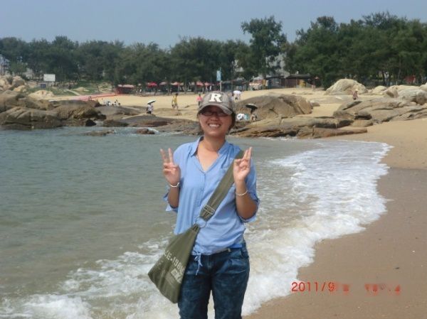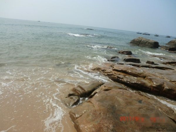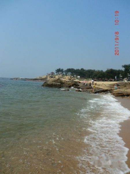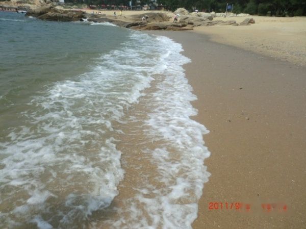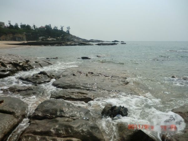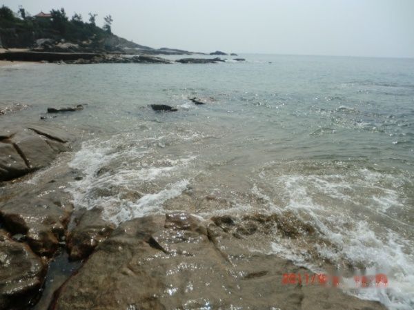 岸边的礁石光滑无比 一脚踩上去滑的很 但是被海浪吹拂着感觉就是爽