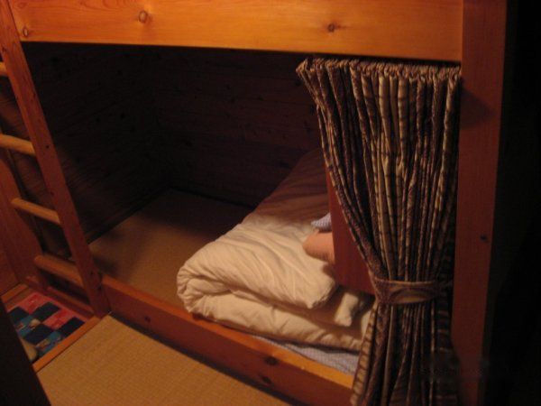 虽然便宜,但淋浴,卫生间,网络什么的还是提供的,虽然浴室很小,除了块破肥皂就一无所有了。连开水也要自己烧,没有热水器。还好房间里有个烧灯油的取暖器,不然的话我真担心靠那纸糊的拉门我们会不会冻感冒了。(由于电脑在阁楼上,想要上网的话就要爬梯子什么的,所以,我这个懒人就没去瞧。)
