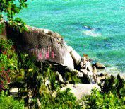 三亚在海南岛的最南端,被蓝透了的海水围着,洋溢着浓浓的热带风情。蓝蓝的天与蓝蓝的海融为一体,低翔的白鸥掠过蓝蓝的海面,真让人担心洁白的翅尖会被海水蘸蓝了。挺拔俊秀的椰子树,不时在海风中摇曳着碧玉般的树冠。海滩上玉屑银末般的细沙,金灿灿亮闪闪的,软软地暖暖地搔着人们的脚板,谁都想捏一捏,团一团,将它揉成韧韧的面。三亚的热带风情,活跃了一天的太阳,依旧像一个快乐的孩童。它歪着红扑扑的脸蛋,毫无倦态,潇潇洒洒地从身上抖落下赤朱丹彤,在大海上溅出无数夺目的亮点。于是,天和海都被它的笑颜感染了,金红一色,热烈一片。时光悄悄地溜走,暑气跟着阵阵海风徐徐地远离。夕阳也渐渐收敛了光芒,变得温和起来,像一只光焰柔和的大红灯笼,悬在海与天的边缘。兴许是悬得太久的缘故,只见它慢慢地下沉,刚一挨到海面,又平稳地停住了。它似乎借助了大海的支撑,再一次任性地在这张硕大无朋的床面上顽皮地蹦跳。大海失去了原色,像饱饮了玫瑰酒似的,醉醺醺地涨溢出光与彩。人们惊讶得不敢眨眼,生怕眨眼的一瞬间,那盏红灯笼会被一只巨手提走。我瞪大双眼正在欣赏着,突然那落日颤动了两下,最后像跳水员那样,以一个轻快、敏捷的弹跳,再以一个悄然无声、水波不惊的优美姿势入了水,向人们道了“再见”。