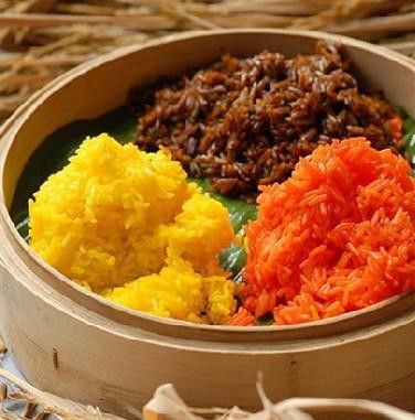三色饭:苗族最具特色的食品,是用山兰糯米、桑叶、红蓝藤叶、黄姜、椰浆、小山棕叶若干包制而成