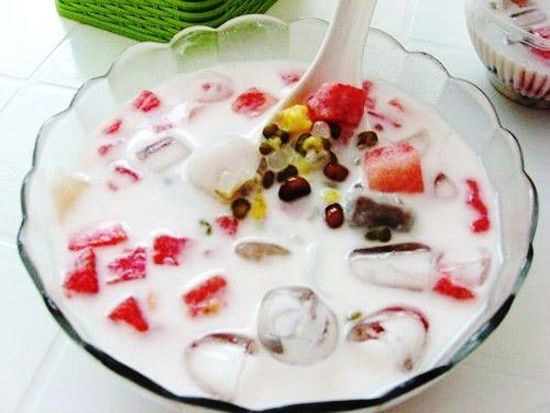 椰奶清补凉:将花生、红豆、绿豆、通心粉、新鲜椰肉、红枣、西瓜粒、菠萝粒、鹌鹑蛋、葡萄干、凉粉块、珍珠、薏米、芋头等,分开煮熟,掺上乳白色的椰奶, 调和成一碗消暑酷爽甜品。椰香味十足,清凉舒爽。