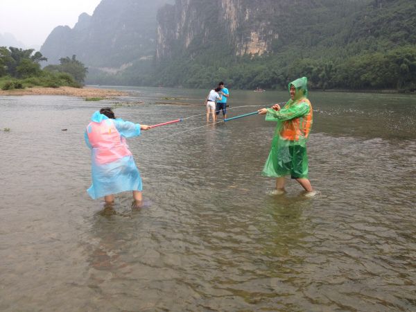 漓江两边的景色非常美丽,那的山有种从中间被劈开的感觉,很有味道,九马画山,鲤鱼出江。八仙过海,真的很佩服当地人的想象力。在着青山绿水间,师傅根据我们心情停到岸边,让我们尽兴打水仗,前一天买的雨衣就派上大用场啦