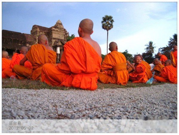 没等到日落的人们都在撤离。一大群身着黄袍的僧人从旁门涌入小吴哥,看起来有重要活动。好奇心旺盛的各国旅客就等在旁边看着拍着。僧人们大多是少年,好奇心也旺盛的他们也忍不住打量我们。