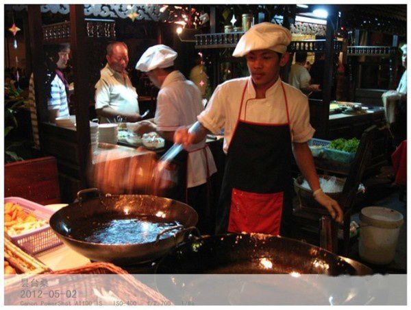 这里果然是旅行团餐的大本营。宽广的大厅里从舞台到门口处摆着好几溜儿桌子,靠舞台近的位置几乎都被旅行团包了,我们这种散客只能坐在最末尾处。