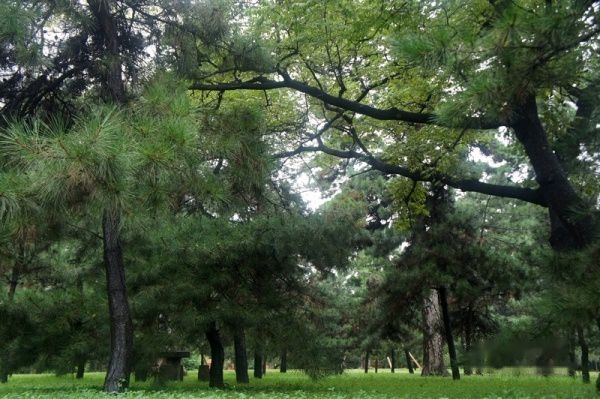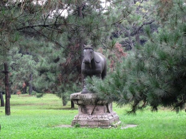 进入正红门,一条神道笔直向北,两侧是郁郁苍苍的松柏。松林中排列着狮、马、驼、虎等四对石像生。这些松树大多有300多年历史,是福陵的一大特色景观。