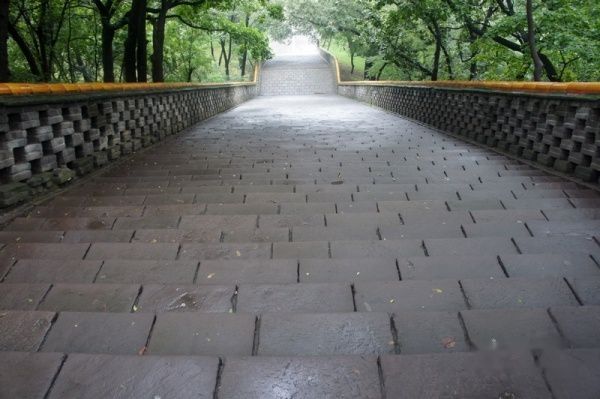 神道的尽头是依山势而建的“福陵天磴“,俗称”一百单八磴“。”欲知福陵绝佳处,石阶送尔上天磴“。福陵天磴是明清皇陵中独一无二的建筑形式。关于其来源,有种种传说,最普遍的两种说法是认为出自道教思想或者是佛教思想。我认为满族人信奉的是喇嘛教,在建造帝王陵墓这样重大的事情上,未必会采纳道教或者佛教的思想。更有可能的是福陵主体建筑全部建在山上,而正红门建在山前平地上,两者之间有一个斜坡。福陵的设计者因地制宜修建了石阶。至于108这个数字,可能是巧合,未必有多少微言大义在里面。