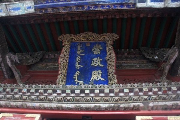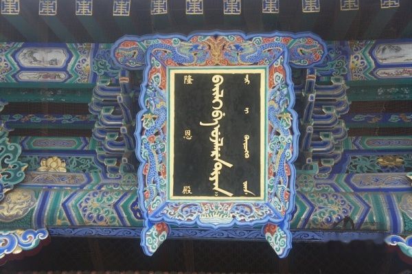 用满、汉、藏三种文字书写的“隆恩殿”匾额。