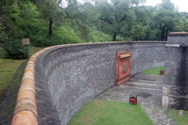 月牙城北面是宝城。宝城中间是一座高大的圆丘,称为宝顶,实际就是坟丘。宝顶下面是福陵的心脏部位——地宫,里面安放在清太祖努尔哈赤和孝慈高皇后的棺椁。